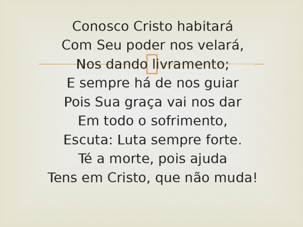 - Conosco Cristo habitaráCom Seu poder nos velará,Nos dando livramento;E sempre há de nos guiarPois Sua graça vai nos darEm todo o sofrimento,Escuta: Luta sempre forte.Té a morte, pois ajudaTens em Cristo, que não muda!