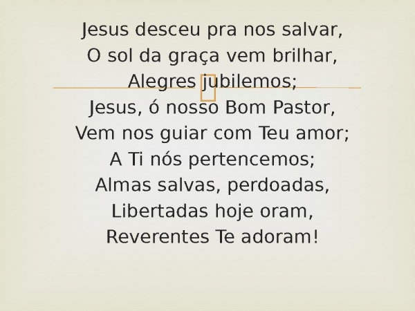 - Jesus desceu pra nos salvar,O sol da graça vem brilhar,Alegres jubilemos;Jesus, ó nosso Bom Pastor,Vem nos guiar com Teu amor;A Ti nós pertencemos;Almas salvas, perdoadas,Libertadas hoje oram,Reverentes Te adoram!