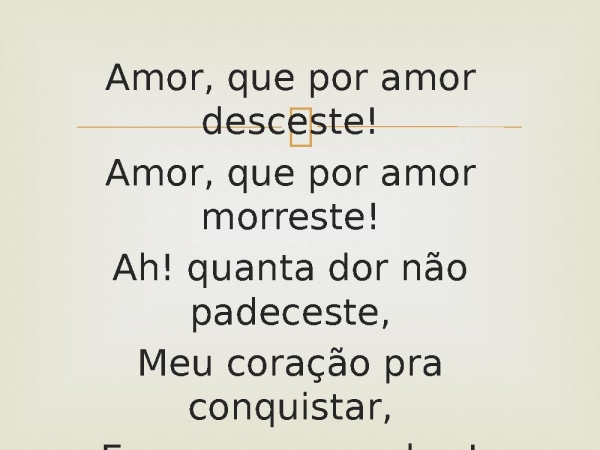 - Amor, que por amor desceste!Amor, que por amor morreste!Ah! quanta dor não padeceste,Meu coração pra conquistar,E meu amor ganhar!