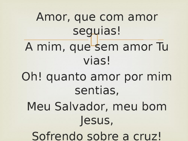 - Amor, que com amor seguias!A mim, que sem amor Tu vias!Oh! quanto amor por mim sentias,Meu Salvador, meu bom Jesus,Sofrendo sobre a cruz!