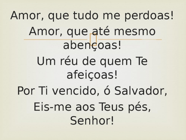 - Amor, que tudo me perdoas!Amor, que até mesmo abençoas!Um réu de quem Te afeiçoas!Por Ti vencido, ó Salvador,Eis-me aos Teus pés, Senhor!