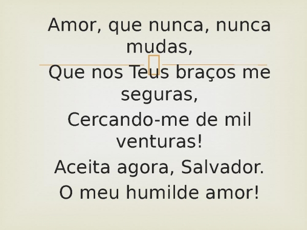 - Amor, que nunca, nunca mudas,Que nos Teus braços me seguras,Cercando-me de mil venturas!Aceita agora, Salvador.O meu humilde amor!