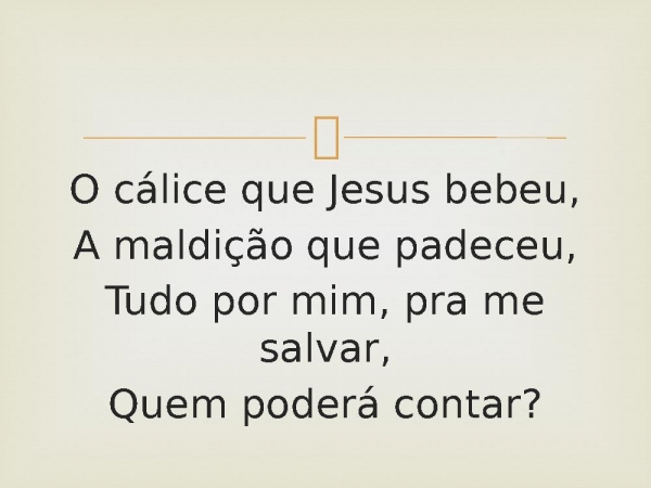 - O cálice que Jesus bebeu,A maldição que padeceu,Tudo por mim, pra me salvar,Quem poderá contar?