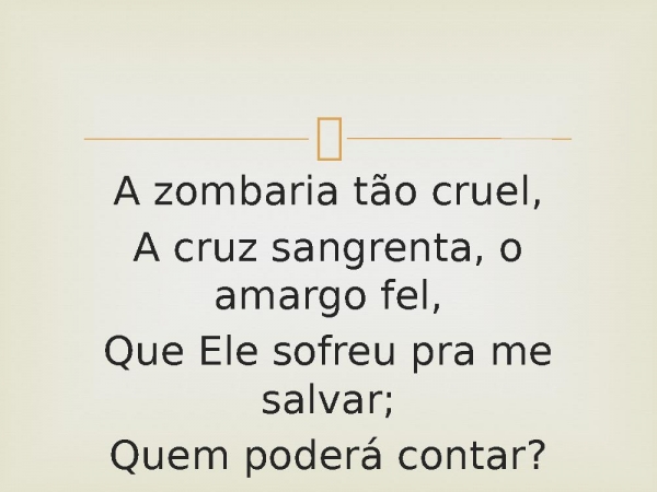 - A zombaria tão cruel,A cruz sangrenta, o amargo fel,Que Ele sofreu pra me salvar;Quem poderá contar?