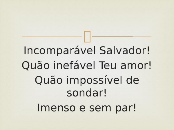 - Incomparável Salvador!Quão inefável Teu amor!Quão impossível de sondar!Imenso e sem par!