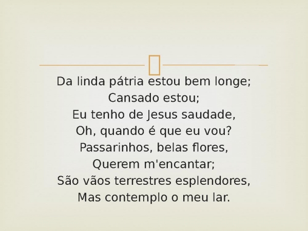 - Da linda pátria estou bem longe;Cansado estou;Eu tenho de Jesus saudade,Oh, quando é que eu vou?Passarinhos, belas flores,Querem m'encantar;São vãos terrestres esplendores,Mas contemplo o meu lar.