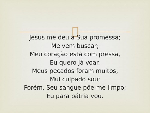 - Jesus me deu a Sua promessa;Me vem buscar;Meu coração está com pressa,Eu quero já voar.Meus pecados foram muitos,Mui culpado sou;Porém, Seu sangue põe-me limpo;Eu para pátria vou.