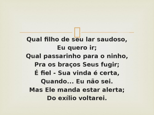 - Qual filho de seu lar saudoso,Eu quero ir;Qual passarinho para o ninho,Pra os braços Seus fugir;É fiel - Sua vinda é certa,Quando... Eu não sei.Mas Ele manda estar alerta;Do exílio voltarei.