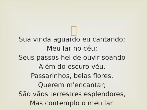 - Sua vinda aguardo eu cantando;Meu lar no céu;Seus passos hei de ouvir soandoAlém do escuro véu.Passarinhos, belas flores,Querem m'encantar;São vãos terrestres esplendores,Mas contemplo o meu lar.