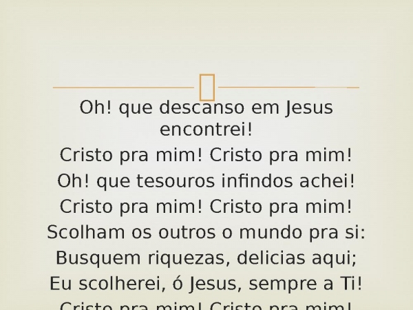 - Oh! que descanso em Jesus encontrei!Cristo pra mim! Cristo pra mim!Oh! que tesouros infindos achei!Cristo pra mim! Cristo pra mim!Scolham os outros o mundo pra si:Busquem riquezas, delicias aqui;Eu scolherei, ó Jesus, sempre a Ti!Cristo pra mim! Cristo pra mim!