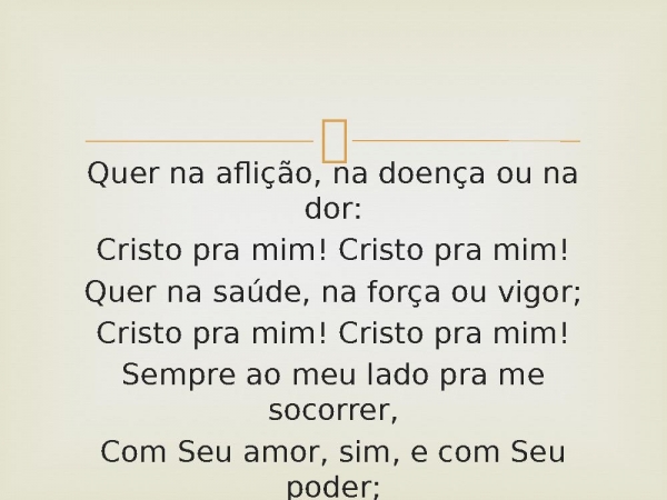 - Quer na aflição, na doença ou na dor:Cristo pra mim! Cristo pra mim!Quer na saúde, na força ou vigor;Cristo pra mim! Cristo pra mim!Sempre ao meu lado pra me socorrer,Com Seu amor, sim, e com Seu poder;Em cada transe pronto a me valer;Cristo pra mim! Cristo pra mim!