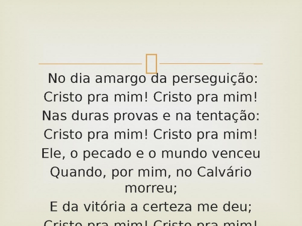 - No dia amargo da perseguição:Cristo pra mim! Cristo pra mim!Nas duras provas e na tentação:Cristo pra mim! Cristo pra mim!Ele, o pecado e o mundo venceuQuando, por mim, no Calvário morreu;E da vitória a certeza me deu;Cristo pra mim! Cristo pra mim!
