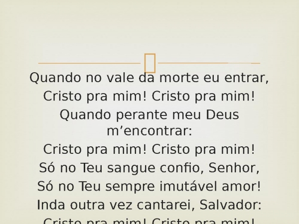 - Quando no vale da morte eu entrar,Cristo pra mim! Cristo pra mim!Quando perante meu Deus m’encontrar:Cristo pra mim! Cristo pra mim!Só no Teu sangue confio, Senhor,Só no Teu sempre imutável amor!Inda outra vez cantarei, Salvador:Cristo pra mim! Cristo pra mim!