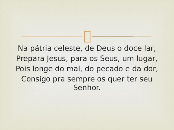 - Na pátria celeste, de Deus o doce lar,Prepara Jesus, para os Seus, um lugar,Pois longe do mal, do pecado e da dor,Consigo pra sempre os quer ter seu Senhor.