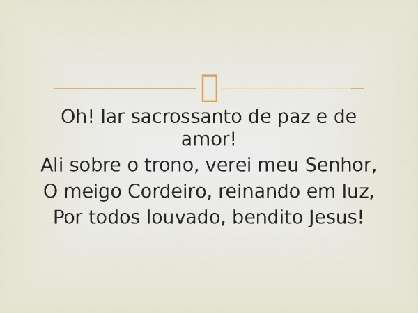 - Oh! lar sacrossanto de paz e de amor!Ali sobre o trono, verei meu Senhor,O meigo Cordeiro, reinando em luz,Por todos louvado, bendito Jesus!
