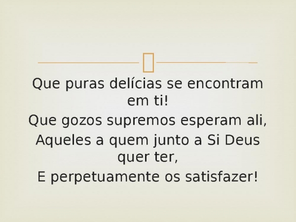 - Que puras delícias se encontram em ti!Que gozos supremos esperam ali,Aqueles a quem junto a Si Deus quer ter,E perpetuamente os satisfazer!