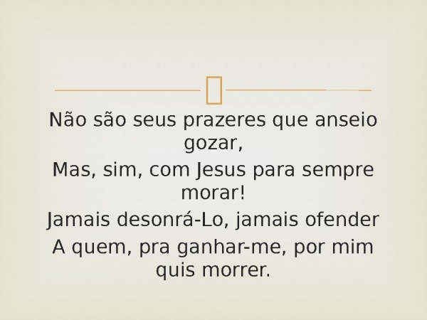 - Não são seus prazeres que anseio gozar,Mas, sim, com Jesus para sempre morar!Jamais desonrá-Lo, jamais ofenderA quem, pra ganhar-me, por mim quis morrer.