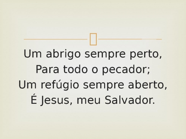 - Um abrigo sempre perto,Para todo o pecador;Um refúgio sempre aberto,É Jesus, meu Salvador.