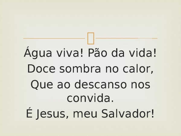 - Água viva! Pão da vida!Doce sombra no calor,Que ao descanso nos convida.É Jesus, meu Salvador!