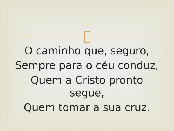 - O caminho que, seguro,Sempre para o céu conduz,Quem a Cristo pronto segue,Quem tomar a sua cruz.