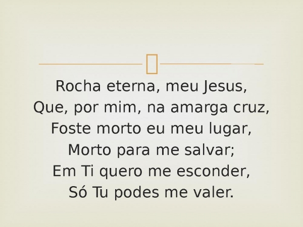 - Rocha eterna, meu Jesus,Que, por mim, na amarga cruz,Foste morto eu meu lugar,Morto para me salvar;Em Ti quero me esconder,Só Tu podes me valer.