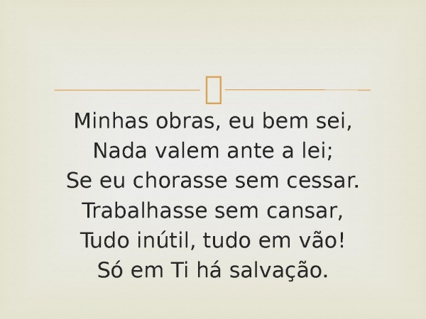 - Minhas obras, eu bem sei,Nada valem ante a lei;Se eu chorasse sem cessar.Trabalhasse sem cansar,Tudo inútil, tudo em vão!Só em Ti há salvação.
