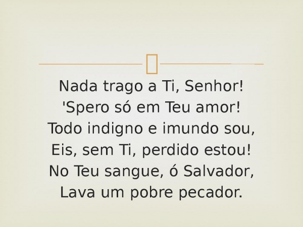 - Nada trago a Ti, Senhor!'Spero só em Teu amor!Todo indigno e imundo sou,Eis, sem Ti, perdido estou!No Teu sangue, ó Salvador,Lava um pobre pecador.