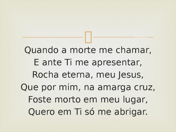 - Quando a morte me chamar,E ante Ti me apresentar,Rocha eterna, meu Jesus,Que por mim, na amarga cruz,Foste morto em meu lugar,Quero em Ti só me abrigar.