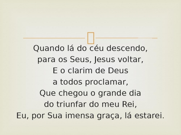 - Quando lá do céu descendo,para os Seus, Jesus voltar,E o clarim de Deusa todos proclamar,Que chegou o grande diado triunfar do meu Rei,Eu, por Sua imensa graça, lá estarei.