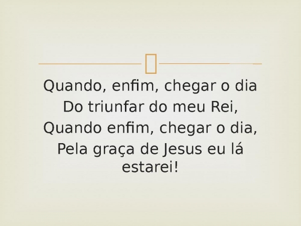- Quando, enfim, chegar o diaDo triunfar do meu Rei,Quando enfim, chegar o dia,Pela graça de Jesus eu lá estarei!