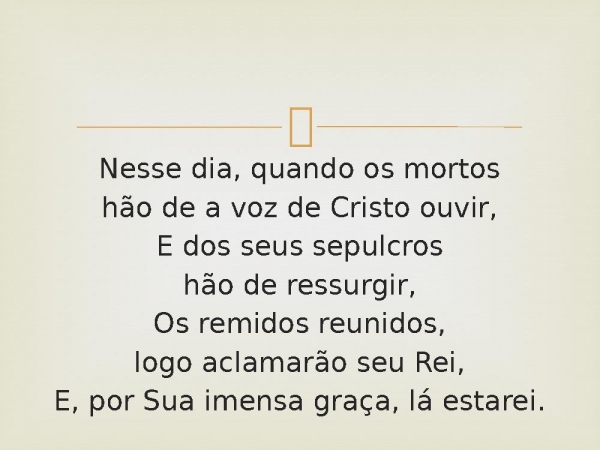 - Nesse dia, quando os mortoshão de a voz de Cristo ouvir,E dos seus sepulcroshão de ressurgir,Os remidos reunidos,logo aclamarão seu Rei,E, por Sua imensa graça, lá estarei.