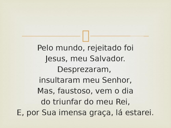 - Pelo mundo, rejeitado foiJesus, meu Salvador.Desprezaram, insultaram meu Senhor,Mas, faustoso, vem o diado triunfar do meu Rei,E, por Sua imensa graça, lá estarei.
