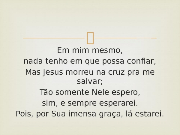 - Em mim mesmo,nada tenho em que possa confiar,Mas Jesus morreu na cruz pra me salvar;Tão somente Nele espero,sim, e sempre esperarei.Pois, por Sua imensa graça, lá estarei.