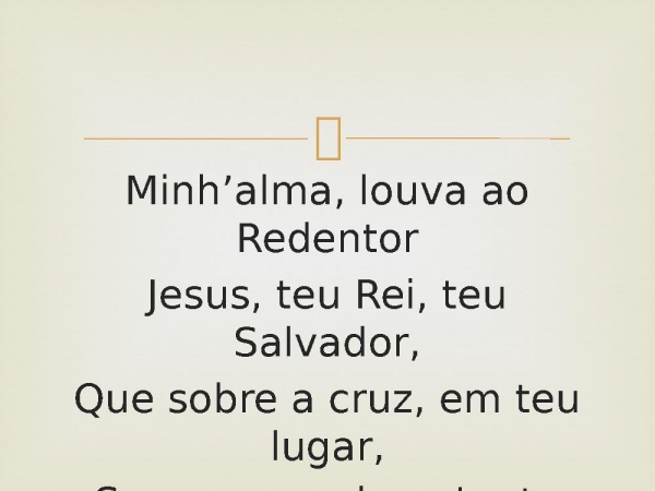 - Minh’alma, louva ao RedentorJesus, teu Rei, teu Salvador,Que sobre a cruz, em teu lugar,Seu sangue deu p'ra te salvar!