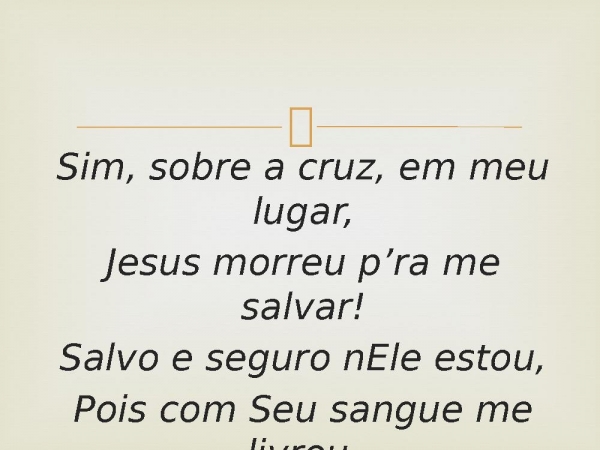 - Sim, sobre a cruz, em meu lugar,Jesus morreu p’ra me salvar!Salvo e seguro nEle estou,Pois com Seu sangue me livrou.