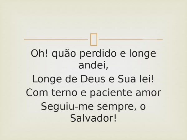 - Oh! quão perdido e longe andei,Longe de Deus e Sua lei!Com terno e paciente amorSeguiu-me sempre, o Salvador!