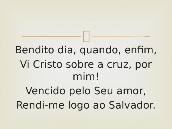 - Bendito dia, quando, enfim,Vi Cristo sobre a cruz, por mim!Vencido pelo Seu amor,Rendi-me logo ao Salvador.