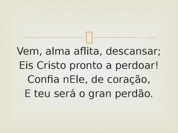 - Vem, alma aflita, descansar;Eis Cristo pronto a perdoar!Confia nEle, de coração,E teu será o gran perdão.