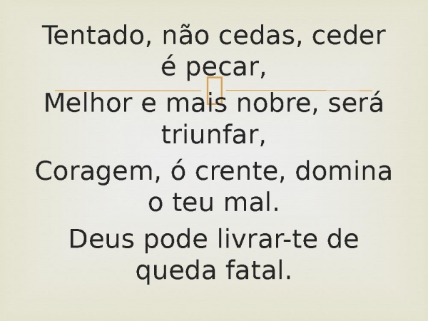 - Tentado, não cedas, ceder é pecar,Melhor e mais nobre, será triunfar,Coragem, ó crente, domina o teu mal.Deus pode livrar-te de queda fatal.