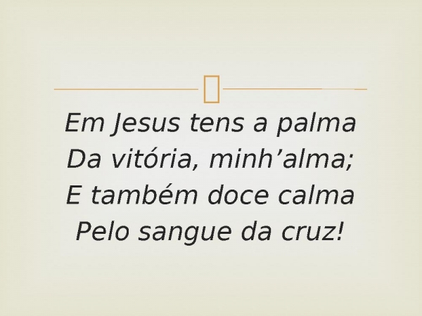 - Em Jesus tens a palmaDa vitória, minh’alma;E também doce calmaPelo sangue da cruz!