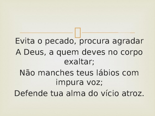 - Evita o pecado, procura agradarA Deus, a quem deves no corpo exaltar;Não manches teus lábios com impura voz;Defende tua alma do vício atroz.