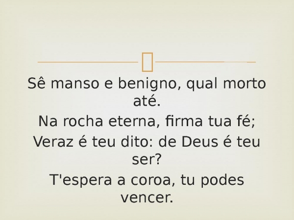- Sê manso e benigno, qual morto até.Na rocha eterna, firma tua fé;Veraz é teu dito: de Deus é teu ser?T'espera a coroa, tu podes vencer.
