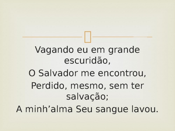 - Vagando eu em grande escuridão,O Salvador me encontrou,Perdido, mesmo, sem ter salvação;A minh’alma Seu sangue lavou.
