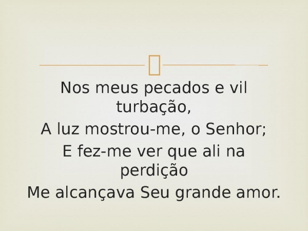 - Nos meus pecados e vil turbação,A luz mostrou-me, o Senhor;E fez-me ver que ali na perdiçãoMe alcançava Seu grande amor.