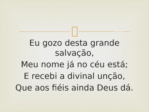 - Eu gozo desta grande salvação,Meu nome já no céu está;E recebi a divinal unção,Que aos fiéis ainda Deus dá.