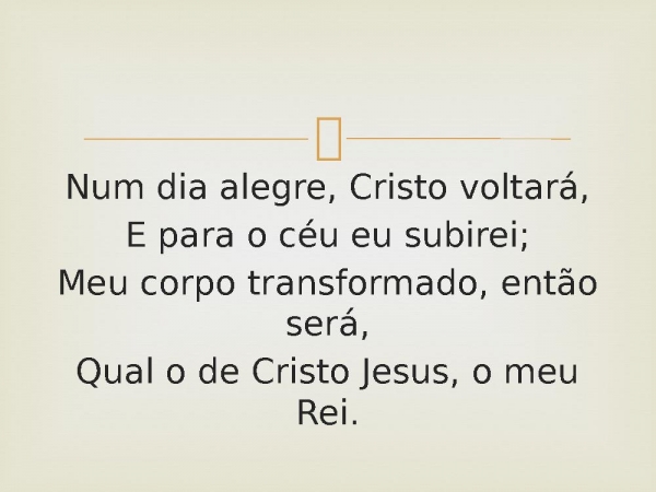 - Num dia alegre, Cristo voltará,E para o céu eu subirei;Meu corpo transformado, então será,Qual o de Cristo Jesus, o meu Rei.