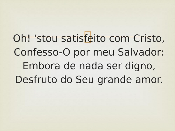 - Oh! 'stou satisfeito com Cristo,Confesso-O por meu Salvador:Embora de nada ser digno,Desfruto do Seu grande amor.