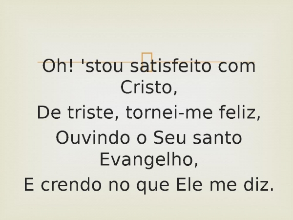 - Oh! 'stou satisfeito com Cristo,De triste, tornei-me feliz,Ouvindo o Seu santo Evangelho,E crendo no que Ele me diz.