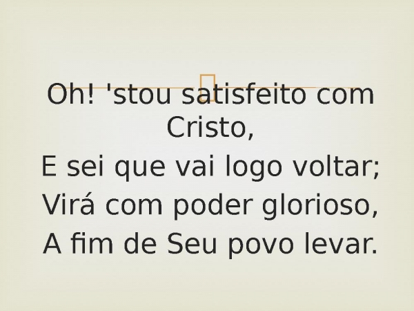 - Oh! 'stou satisfeito com Cristo,E sei que vai logo voltar;Virá com poder glorioso,A fim de Seu povo levar.