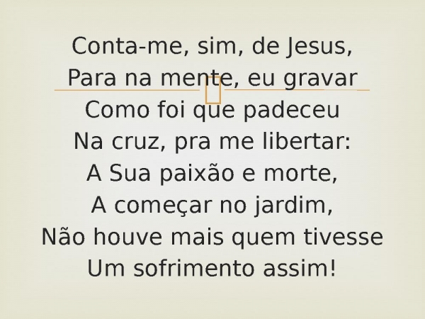 - Conta-me, sim, de Jesus,Para na mente, eu gravarComo foi que padeceuNa cruz, pra me libertar:A Sua paixão e morte,A começar no jardim,Não houve mais quem tivesseUm sofrimento assim!